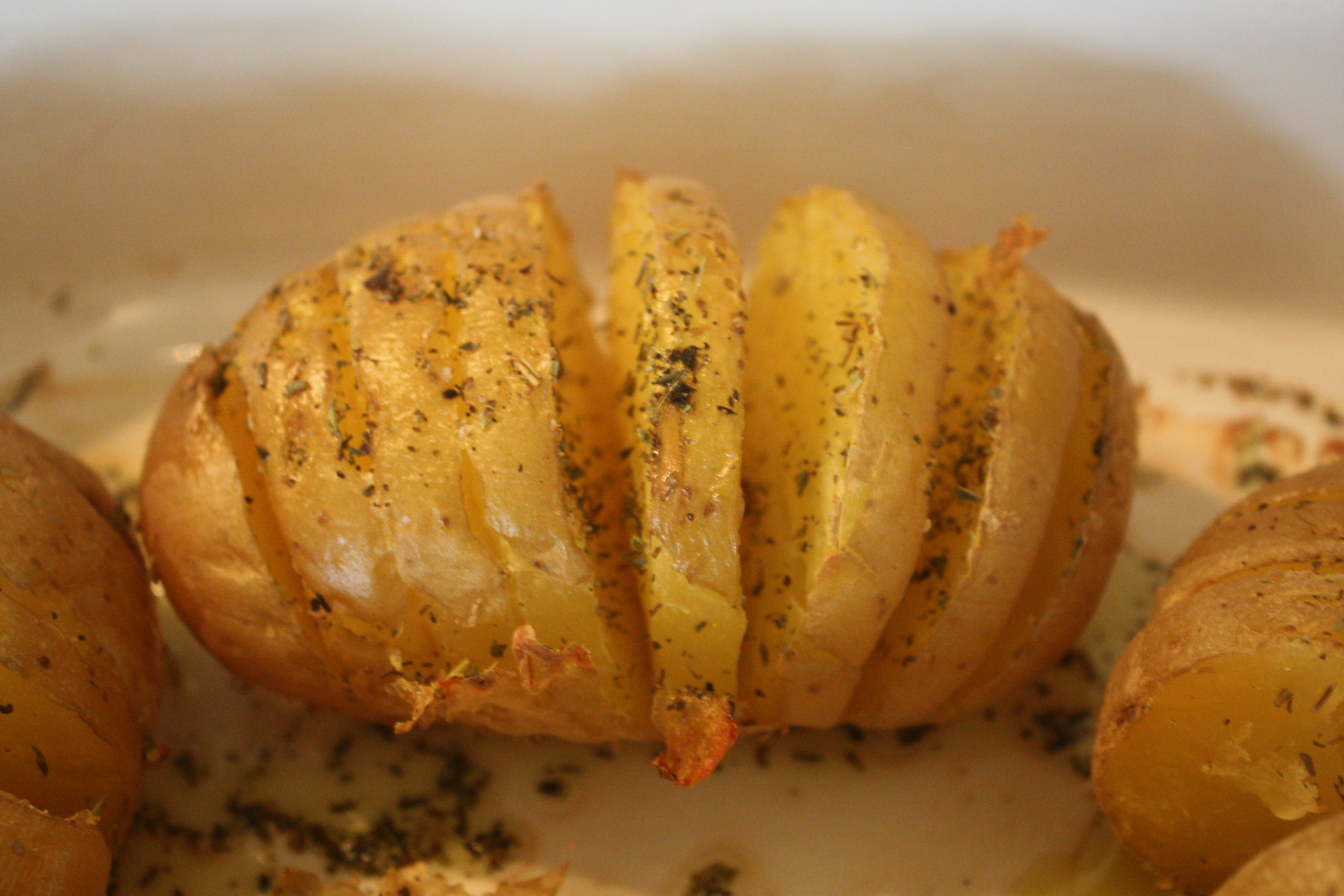 Préchauffez votre four à 180°. Videz l’eau et laissez refroidir vos pommes de terre. Faîtes-leur des tranches d’un demi-centimètre, en vous arrêtant à quelques millimètres du bas du légume. Placez-les dans un plat allant au four, avec un fond d’eau pour ne pas qu’elles sèchent. Salez, poivrez, saupoudrez généreusement d’herbes aromatiques, types herbes de Provence, basilic et thym. Laissez couler un filet d’huile d’olive dans les entailles. Faîtes cuire au four 25 minutes environ. N’oubliez pas de remettre de l’eau au fond du plat si des minutes de cuisson supplémentaires sont nécessaires.