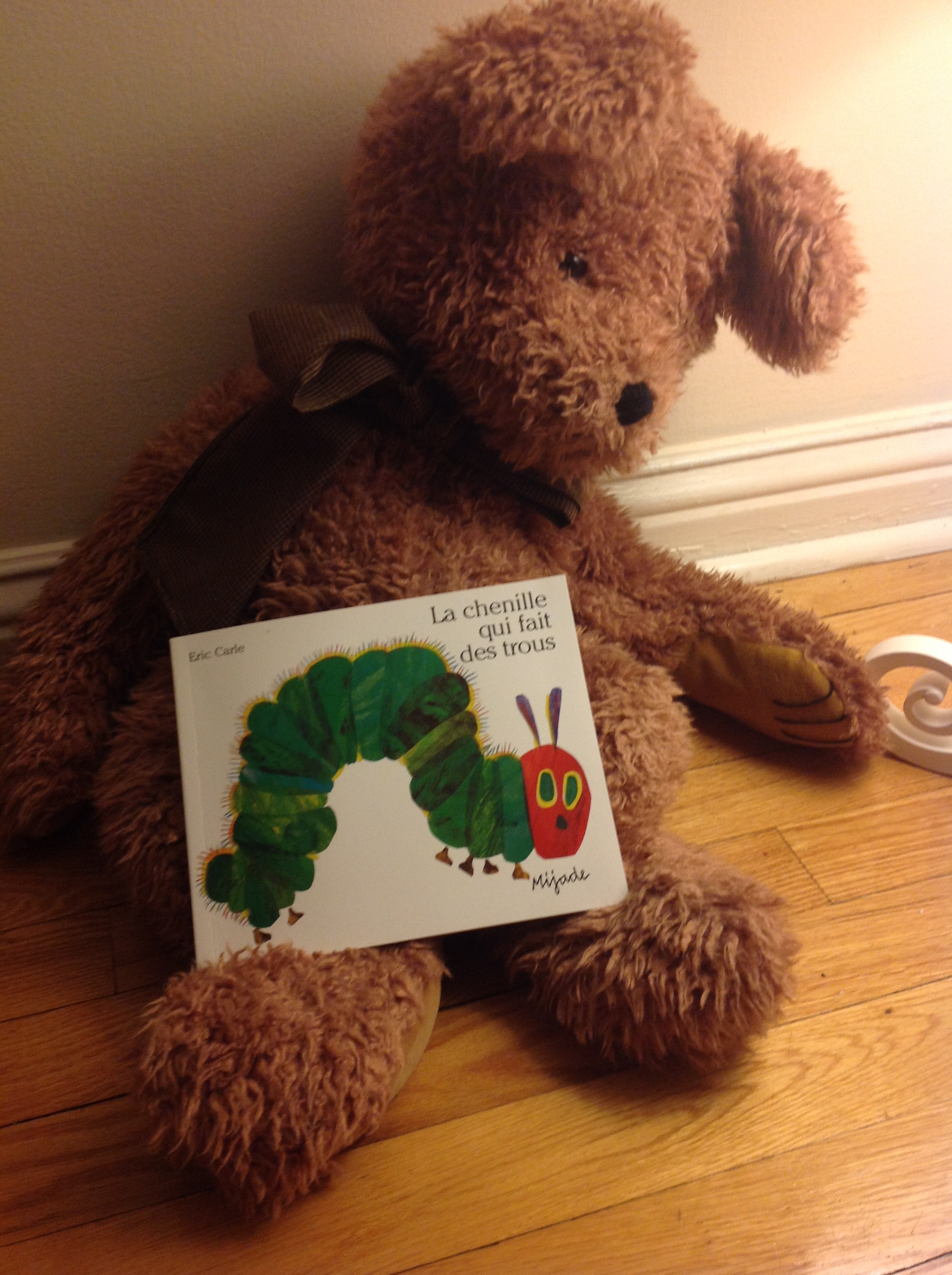 Il a une place spéciale dans la chambre de Miss Swing. Posé sur les genoux de l’ours, il décore la pièce comme un tableau. Un tableau que l’on plie, que l’on griffe, que l’on redécouvre chaque semaine. La chenille qui fait des trous, d’Eric Carle, (The very hungry caterpillar, dans sa version anglaise) est un livre superbe. Il est tendre, drôle et l’écriture est suffisamment rythmée pour que le parent prenne du plaisir à le lire à haute voix. L’histoire est celle, bien connue, de la chenille qui devient papillon. Sauf que cette chenille-là est incroyablement gloutonne!