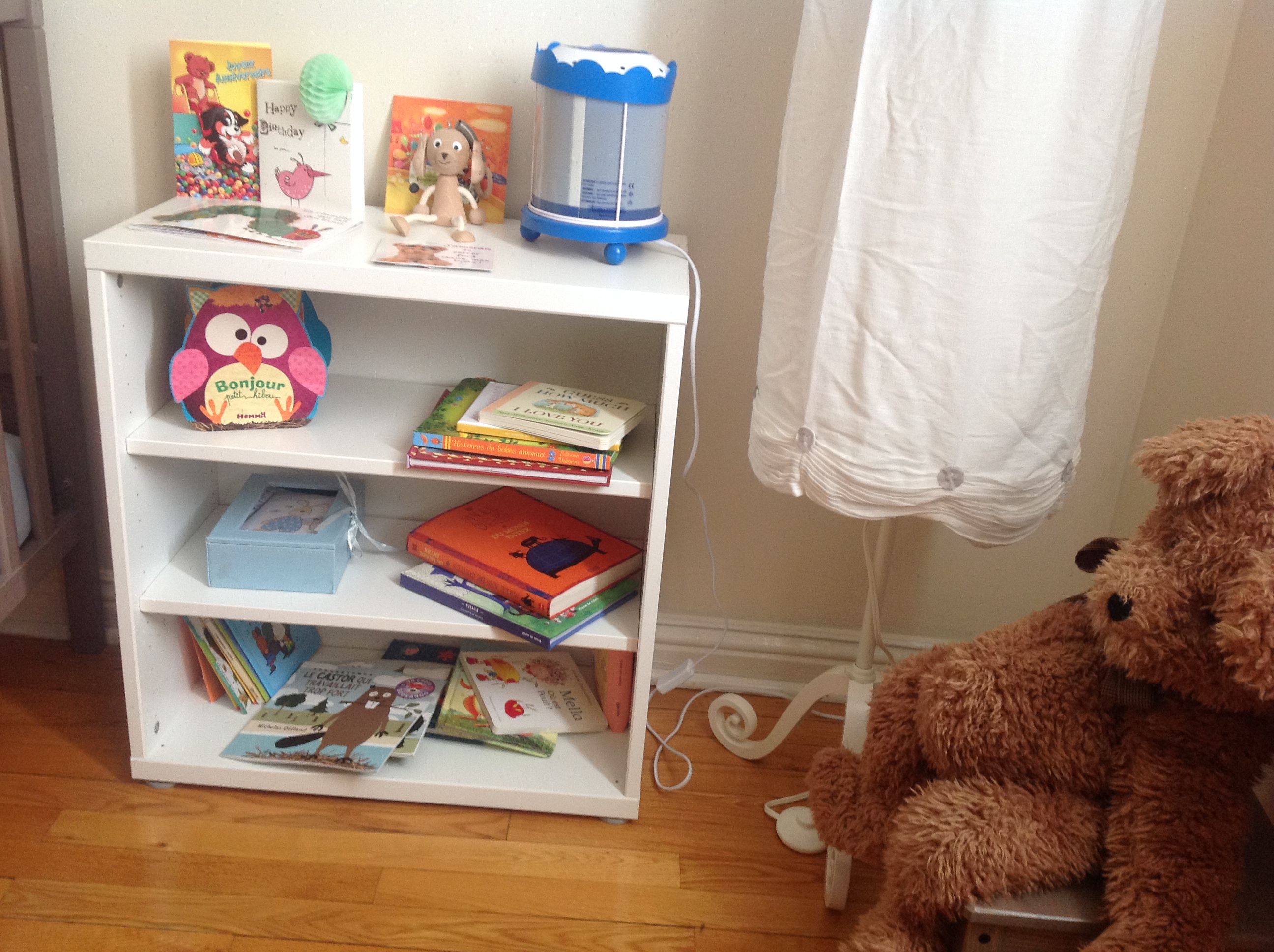 Alors la semaine dernière, après un tour au rayon enfant d’Ikea, nous avons investi dans un petit meuble blanc. Le dessus de cette bibliothèque est encore suffisamment haut pour que l’on puisse y poser cette veilleuse qu’elle démonte tout le temps. Le reste est accessible malgré ses 73 cm (l’infirmière l’a mesurée à 75 cm ce matin mais Mr Swing a reconnu qu’il était encore en train de l’installer lorsqu’elle a pris les mesures!) et elle s’en donne à cœur joie! Chaque soir, elle choisit le livre qu’on va lui lire, chaque matin elle en sort cinq ou six qu’elle abandonne sur le sol… Aimera-t-elle lire après ça? Je l’espère! Elle aura au moins le loisir de choisir car il n’y a rien de pire à mes yeux que des lectures imposées.