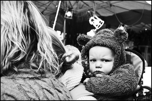 Deux minutes et deux arrêts plus tard, le bus s’est encore rempli. La foule est compact et respire avec peine. Impossible de sortir la poussette sans tuer deux ou trois personnes. Il faudrait littéralement leur “passer sur le corps” et mon mètre 60 vient de rougir devant le grand monsieur en forme d’armoire Louis XV.