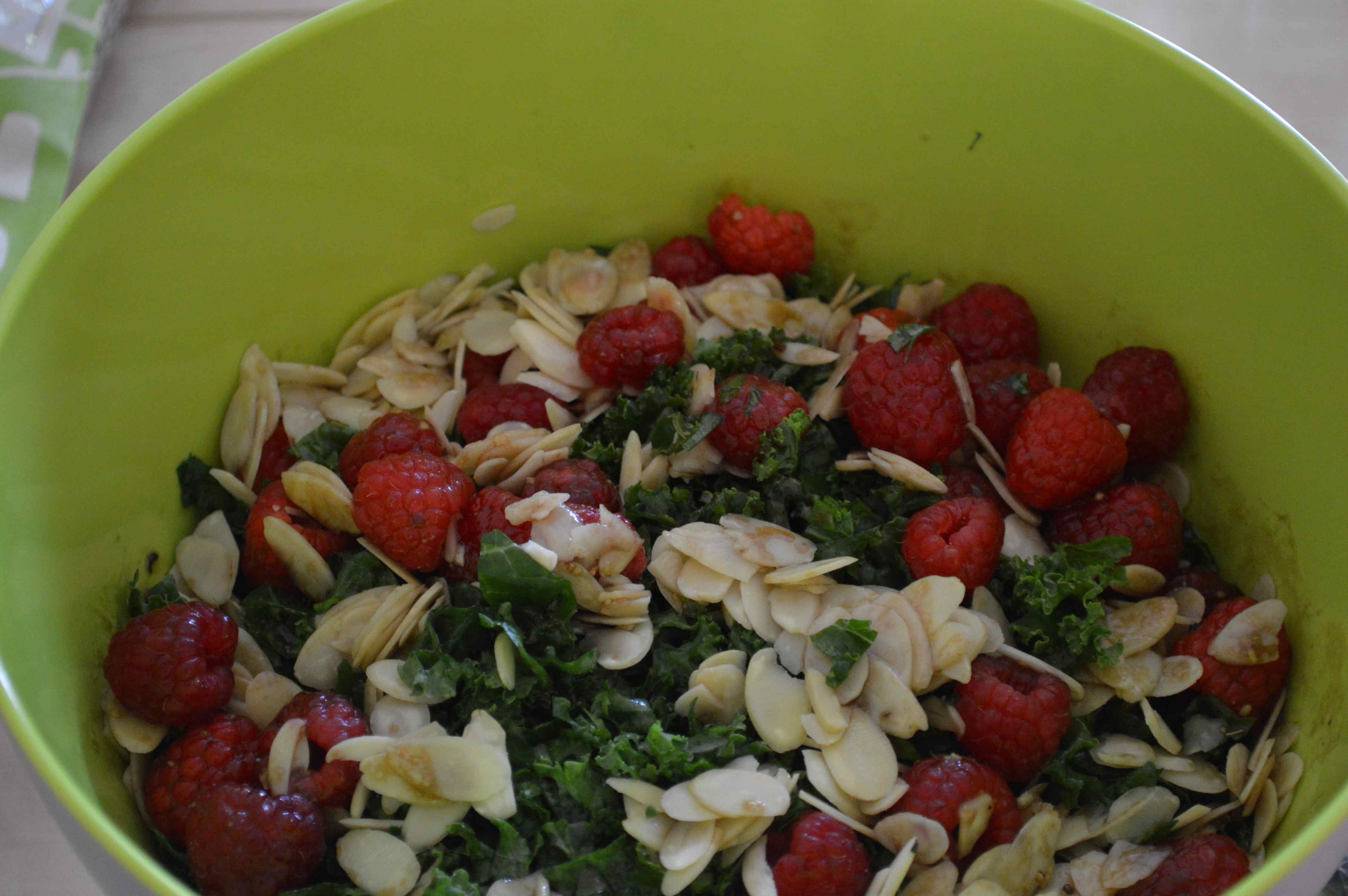 La semaine dernière, après un maigre magasinage, nous avons décidé de faire halte chez un petit restaurateur de notre quartier. Parmi ses salades, il proposait un mélange savoureux : salade de chou vert frisé (kale), framboises, amandes effilées grillées et vinaigrette au sirop d’érable. Une recette sitôt adoptée et refaite par Mr Swing dans la foulée. A tester ab-so-lu-ment.