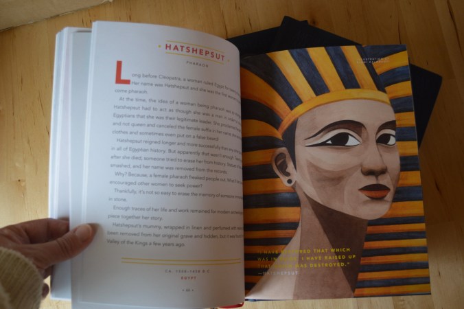 C’est quoi exactement? Un recueil de biographies joliment racontées. Côté gauche, le texte, côté droit un dessin représentant la femme dont il est question. Toutes sortes de femmes qui ont marqué l’histoire y sont évoquées, comme les sœurs Brontë, Ada Lovelace, mathématicienne hors pair, l’aviatrice Amelia Earhart, Amna Al Haddad, championne de lever de poids…