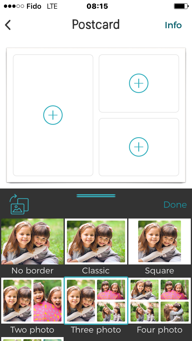 Une fois téléchargée (gratuitement), j’ai lancée l’application et me suis offert un crédit de 5 cartes. Différents modèles étaient proposés, ressemblants au principe des cartes postales habituelles : 2 cases, 3 cases, 4 ou plus… J’ai choisi des photos bien éclairées, et j’ai monté mon agencement. A l’arrière de ma carte, j’ai tapé mon texte, le même que celui que j’aurais écrit à la main depuis la plage (« on s’amuse bien à Sandbanks, les filles font des châteaux de sable… ») et j’ai rentré l’adresse de ma grand-mère après l’avoir enregistrée dans le carnet d’adresses de l’application. Elle l’a reçue trois jours plus tard et elle était ravie. Des photos de sa petite-fille, de ses arrieres-petites-filles, de la plage en fond, du lac superbe où nous nous sommes arrêtés un après-midi…