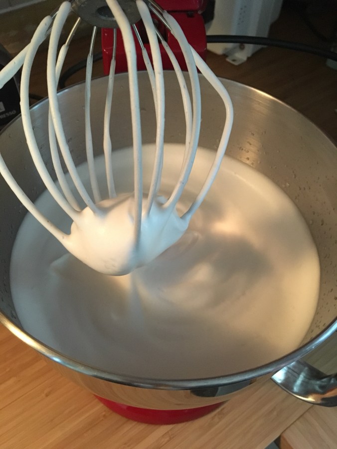 – Lancez le batteur à pleine puissance et montez votre liquide en neige, jusqu’à obtenir une mousse consistante (un bec d’oiseau se forme lorsqu’on retire le fouet).