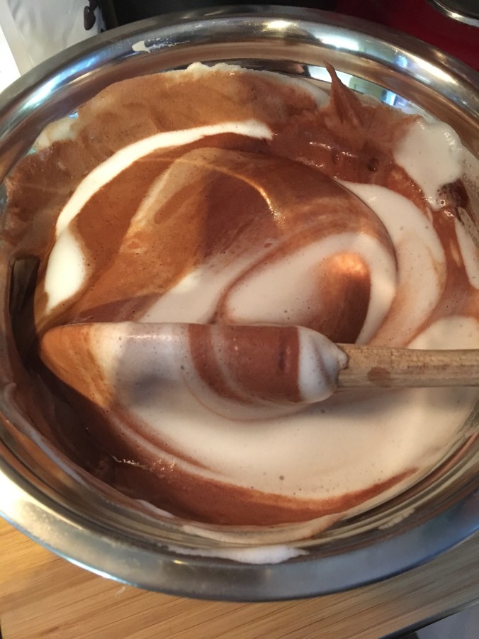– Une fois le chocolat détendu, incorporez cuillère par cuillère votre aquafaba, à la cuillère en bois ou à la maryse, tranquillement, sans casser votre blanc.