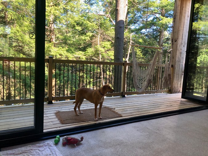 À noter la présence d’une souris qui nous a tenus éveillés la première nuit – la regarder lécher les assiettes qu’on avait eu la flemme de nettoyer était cependant assez fascinant (j’aime les rongeurs et elle était minuscule). Nous avons pris la peine de tout garder propre et enfermé les nuits suivantes et nous n’avons plus eu de visites. Nous avons pu aussi observer à loisir de très jeunes écureuils, des suisses, des geais bleus et même un renard (seulement moi, je suis choyée).