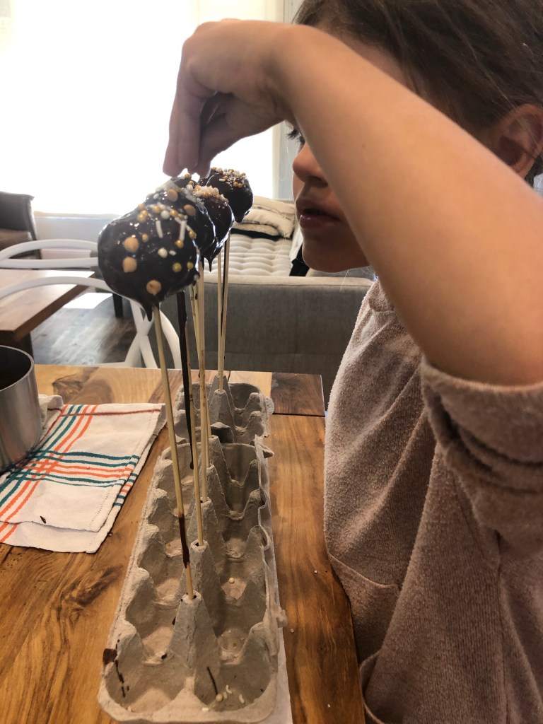 Elles ont joué dehors une partie de la journée, inventant un fort entre les pierres de notre ancien muret, entreposées temporairement le long de l’allée. Elles sont rentrées à 15h tapantes, les joues terreuses et les yeux affamés. « C’est l’heure de faire des cakes pops! » ont-elles clamé. J’avais cuit dans la matinée un quatre-quart dont j’avais déjà boulotté une part en cachette, le privilège des prévoyants. Après un long passage à la salle de bains pour se délivrer de toute la boue logée sous leurs ongles, elles ont plongé avec délice les mains dans le bol du gâteau. L’exercice est plaisant, avec les cakes pops : le gâteau est à réduire en miettes. Sitôt cette étape réalisée, elles l’ont malaxé joyeusement avec du mascarpone, avant d’en former des boules imparfaites. Quelle pâte à modeler au monde peut se vanter de se dévorer entre les doigts ? Le résultat étant à la hauteur de leurs attentes enfantines : chocolaté et plein de sprinkles croquants et pailletés. A peine secs, ils ont disparu dans leurs gosiers affamés, et dans ceux des chiens, qui savent toujours se tenir à l’endroit exact où les enfants échappent le morceau de gâteau volage.