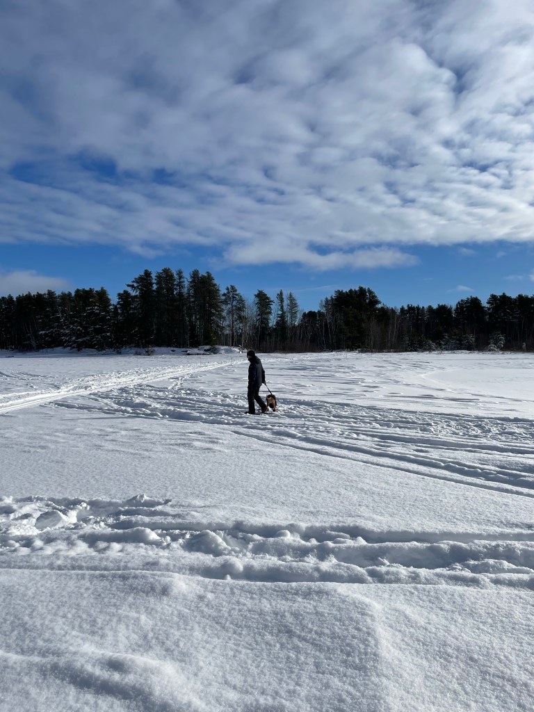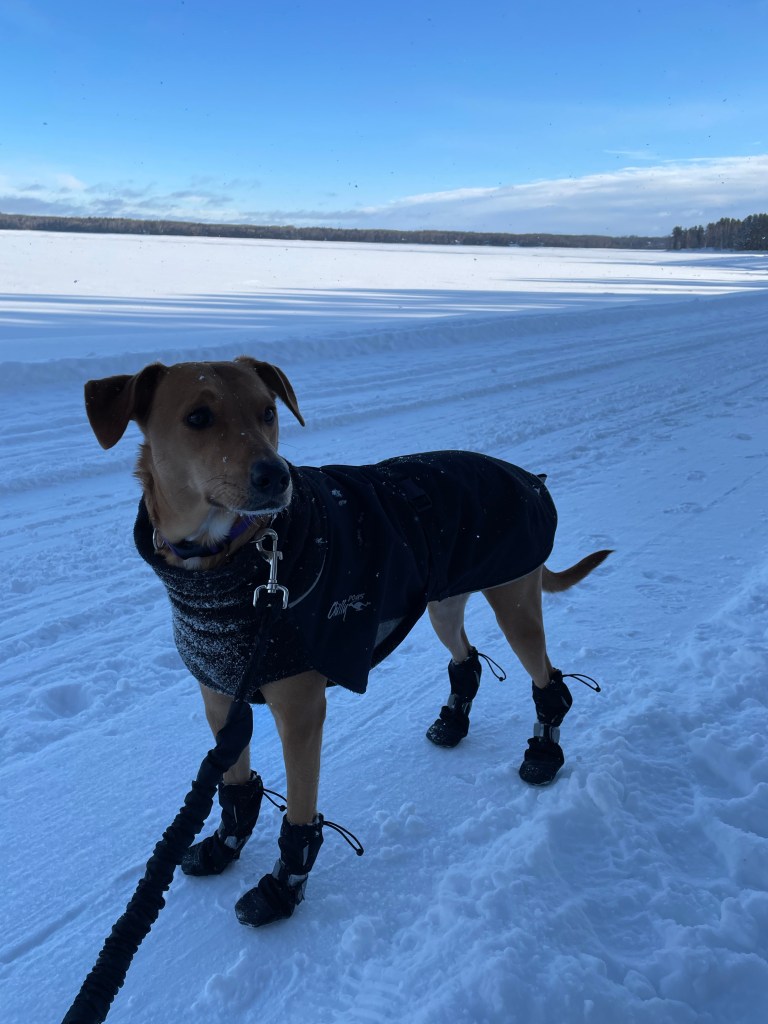 Le lendemain, nous nous réveillons avec enthousiasme. Le site regorge de belles activités et nous sommes curieux de voir ce que nous pouvons explorer. Je sors promener Poppy, qui étrenne ses toutes nouvelles bottes, et tombe nez-à-nez avec une meute de chiens de traîneaux solidement harnachés. A peine le temps de nous jeter sur le bas-côté, et les voici qui nous dépassent en trombe, galopant sur la plage du lac, recouverte de neige. Remises de nos émotions – nous n’étions pas sur le bon chemin, d’où la rencontre impromptue – nous entrons dans l’espace dédié aux locations, Poppy faisant sensation avec ses bottes, son manteau et les tremblements qui se manifestent dès que quelqu’un la regarde de (trop) près. Le personnel nous confirme alors ce que nous espérions : beaucoup de locations sont gratuites, comme les skis de fond, les raquettes, les tubes de glisse ou encore les patins. Les fatbikes sont payants, mais à un prix très accessibles, et seules les sorties en motoneige et en traineaux à chiens restent une dépense conséquente pour qui souhaite vivre la grande aventure. De notre côté, rien de si fou. Notre sortie en traîneaux à chiens est prévue pour plus tard dans l’hiver et les motoneiges ne sont guère autorisées aux mini-pouces qui nous accompagnent.