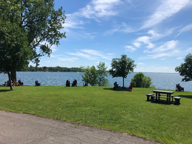 C’est sous un soleil tonitruant que nous y sommes allés le week-end dernier. L’île Saint-Bernard, nichée au bord du Saint-Laurent, non loin de Châteauguay, est un havre. De paix, de tranquillité, et de joie aussi. On a pique-niqué au bord de l’eau, l’air chaud rendu respirable par une douce brise venue du fleuve. Les moustiques n’étaient pas légion, malgré la proximité de l’eau, et je n’ai presque pas eu à bondir sur mes pieds pour éviter les vilains insectes dont j’ai la phobie (tout ce qui vole et surtout vrombit).
