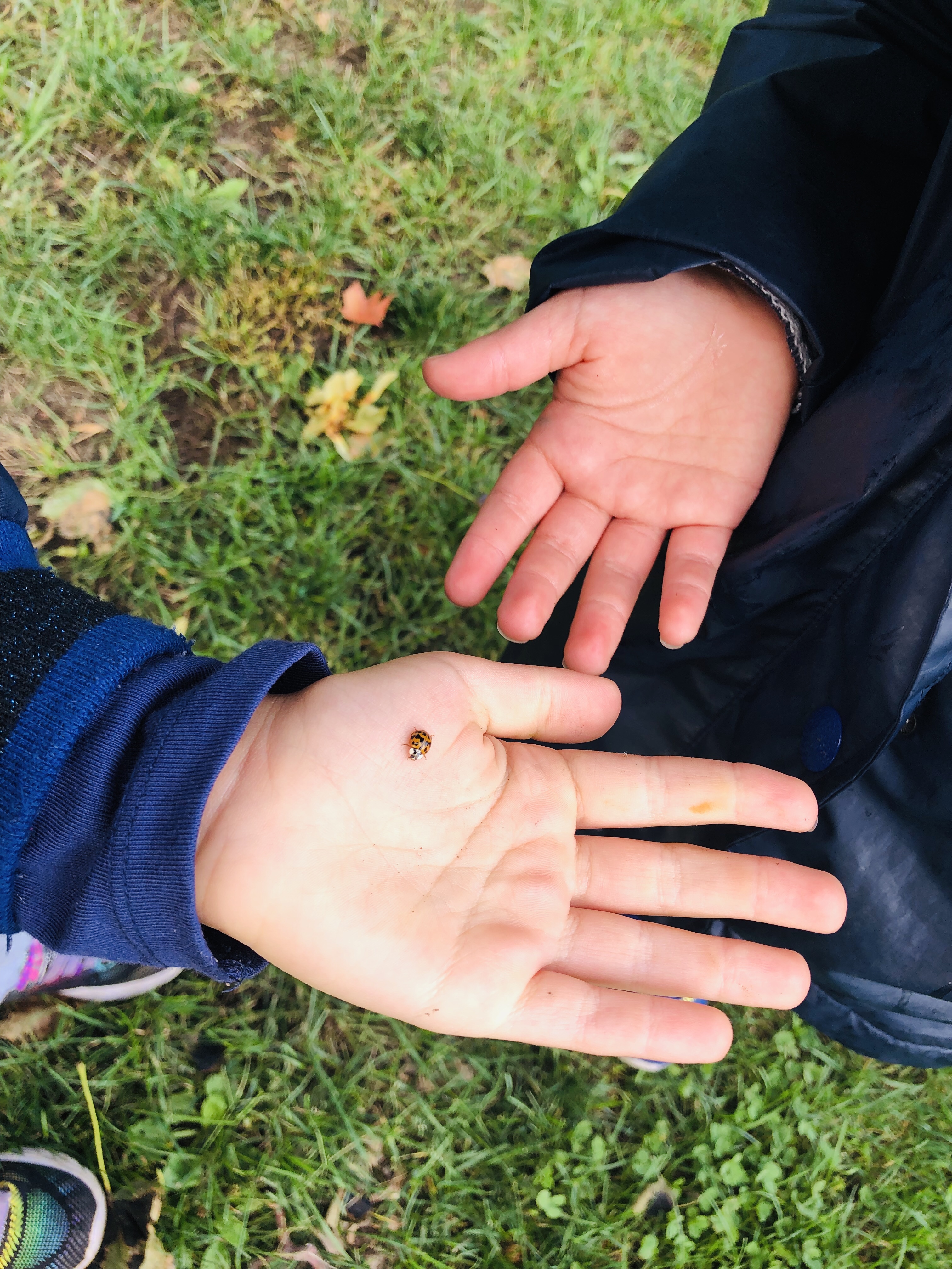 Notre récolte faite, nous avons traversé le petit cimetière qui abrite les Soeurs décédées de la communauté, dans lequel B. a découvert une coccinelle, puis nous avons tranquillement descendu le chemin vers le fleuve. Entendant des cris d’excitation en contrebas, mes filles ont choisi de suivre le mouvement enfantin générale et de se lancer dans la pente en roulé-boulé, récoltant au passage leur lot de feuilles mortes et branchages. Qui n’a jamais vu un tel attirail s’accrocher dans un chignon ignore à quel point cela peut-être seyant!