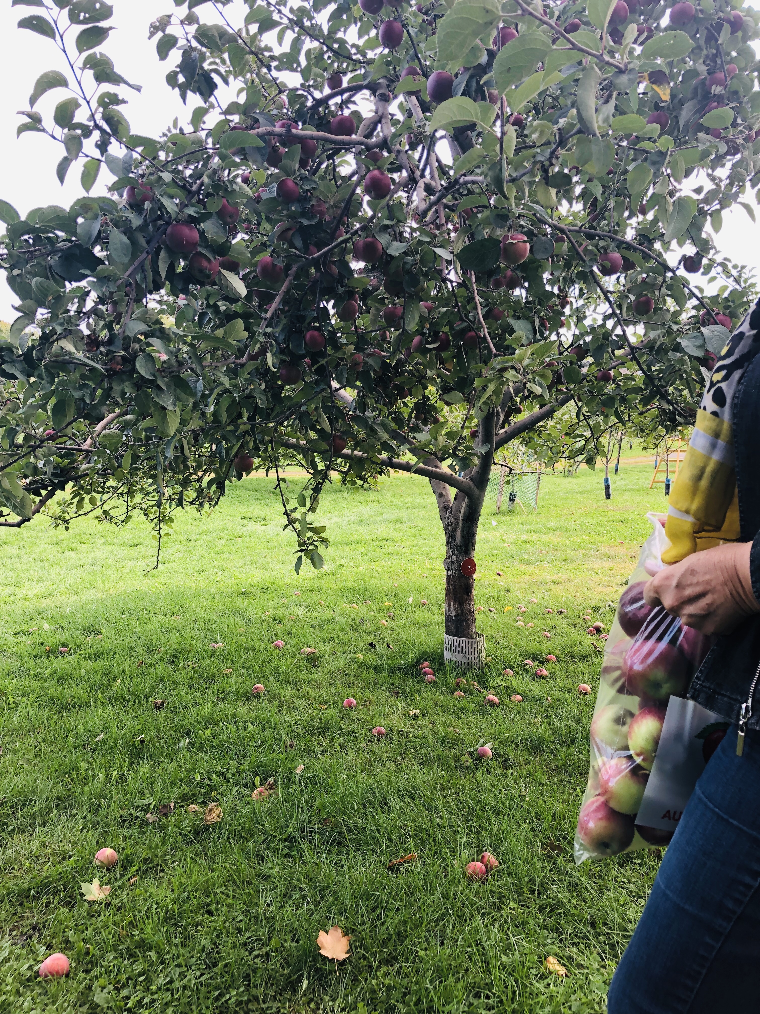 Les sacs de pommes se vendent au prix de 7, 13 ou 22 dollars, selon la quantité de pommes que l’on souhaite ramasser. Armés d’un sac de dix livres – on a souvent les yeux plus grands que notre capacité à cuisiner nos pommes et j’ai désormais le recul de quelques années à tenter de refiler mes fruits flétris à tout le voisinage faute de temps – nous avons pris connaissance du plan à l’entrée puis arpenté le verger à la recherche des meilleures variétés de «pommes pour compote».
