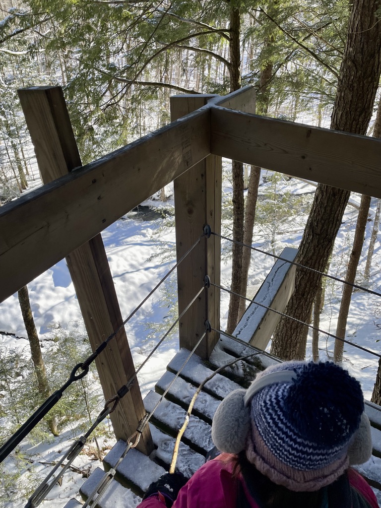 La balade est belle, entrecoupées de photos et de plaintes de Tempête qui ne voit pas l’intérêt de marcher ainsi à travers la forêt. Elle se fait plus difficile lorsque la neige se fait plus épaisse et le vent plus fort, nous contraignant à rebrousser chemin. Nous revenons finalement, émerveillés par la plaine de neige qui s’étend à perte de vue. Les promeneurs se font rares et le sentiment d’être minuscules face à l’immensité, bien réel. Après avoir reposé le matériel, nous filons au pub-restaurant ouvert sur l’heure du midi. La file est un peu longue mais une table se dégage finalement pour nous. Au menu, poutines et bières, forcément. Nous ne sommes pas devenus Québécois pour rien. Après ce repas réconfortant et une longue pause, nous repartons pour le centre de location pour nous équiper, cette fois, de ces énormes tubes qui permettent de glisser en toute sécurité sur les pentes aménagées.