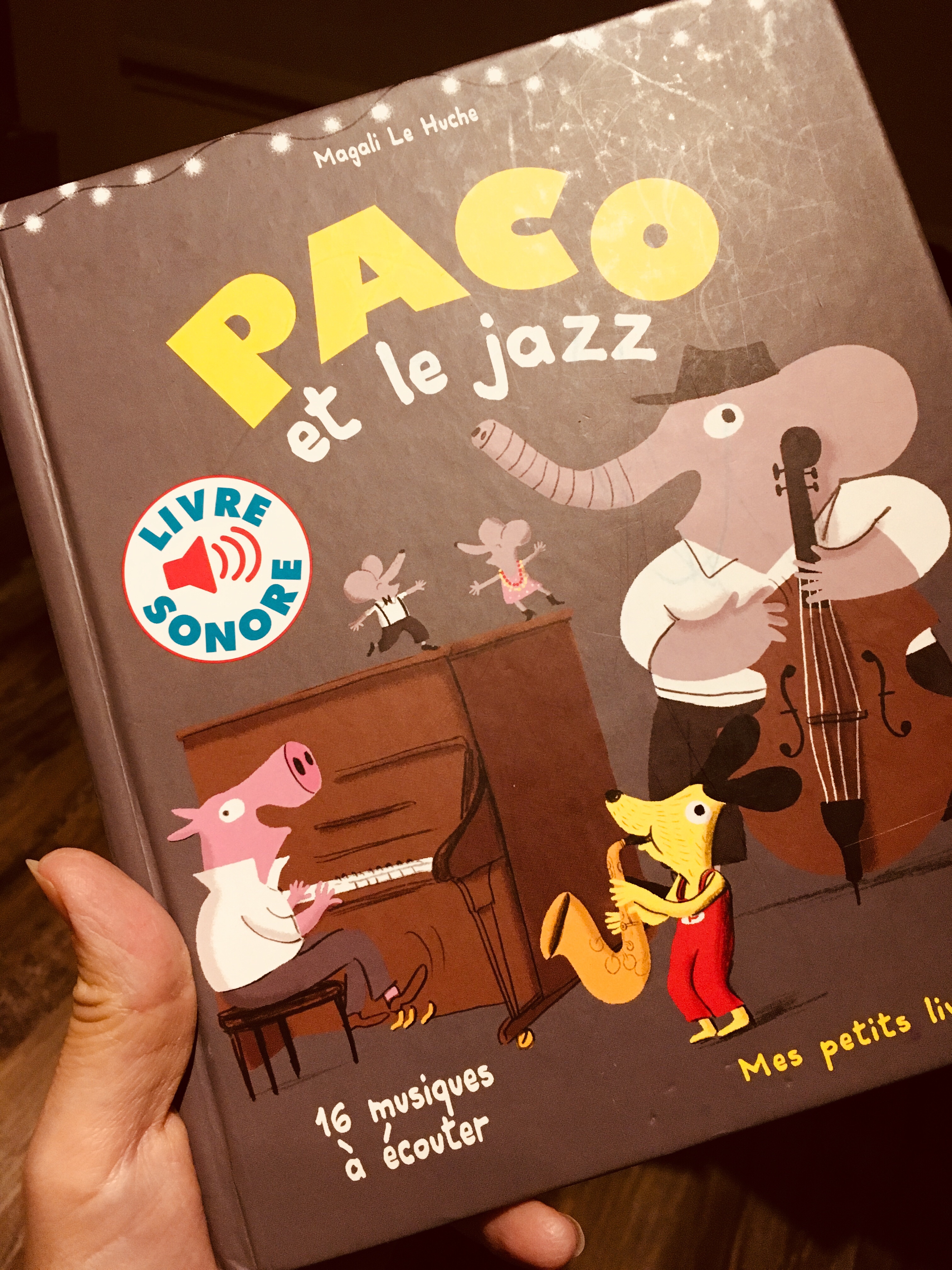 « Bébéouba » – le surnom de Paco et le jazz, appelé ainsi à cause de l’extrait « voix » d’Ella Fitzgerald du livre – est depuis toujours notre livre phare. Offert par une amie, après que B. l’ait découvert dans les mains (et sous les boucles) de son fils, il a connu des jours heureux chez nous. Adoré de ma première, puis plus tard de ma deuxième fille, mille fois recollé, il chante toujours entre leurs mains, trois ans après. Sans changement de pile – un exploit si l’on considère que notre maison est pleine de livres sonores dont certains avaient déjà les piles vides quand ils sont arrivés chez nous – il emplit chaque matin et chaque soir notre maison de notes joyeuses.