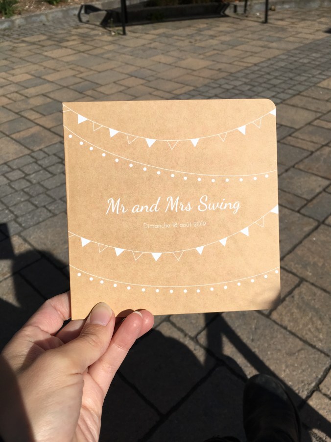 Reste cette carte. La courbe délicate de nos noms d’emprunt. La photo à l’intérieur dont j’ai changé la teinte. Les pleins et les déliés, la rondeur des mots d’annonce. J’adore cette carte. L’annonce et les noms sont faux mais le bonheur et l’amour y sont véritables.