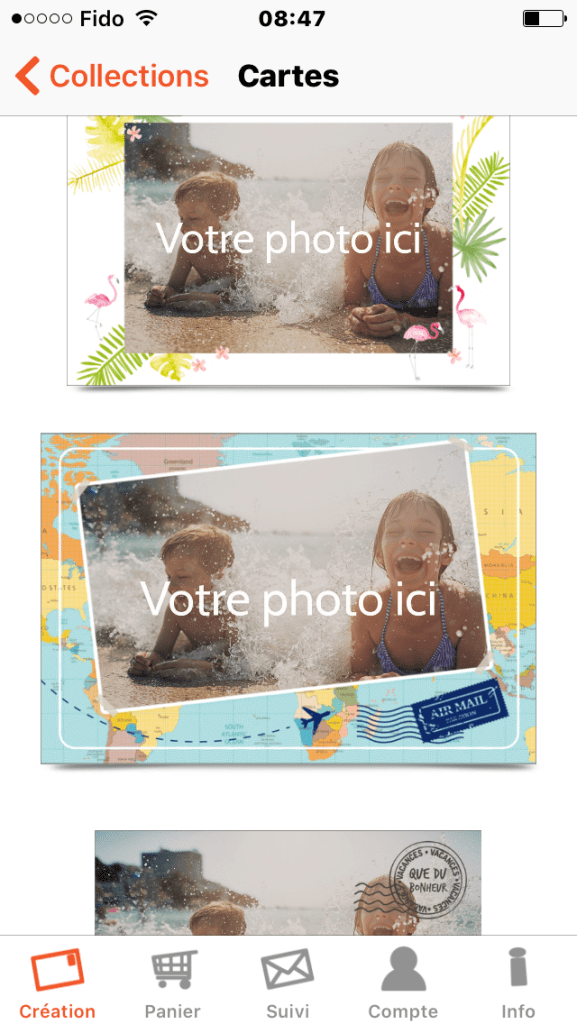 C’est par elles que tout est arrivé, un précédent essai ayant donc mené à d’autres. Pour l’occasion, j’ai sollicité de nouveau Mamy, dont le mur ferait pâlir n’importe quel collectionneur. J’ai procédé comme la dernière fois : une fois l’application Popcarte téléchargée gratuitement – j’ai utilisé le site internet pour mes autres créations – j’ai pu naviguer parmi les propositions. L’application est ludique, facile à utiliser. Il existe un onglet spécifiquement appelé cartes postales, avec un design particulier et le genre de petits messages que vous pouvez trouver sur les cartes du bord de mer («Vacances les pieds dans l’eau à Saint-Malo», «Bisous salés»… vous voyez ce que je veux dire?), le tout agrémenté de dessins de glaces, de coquillages ou d’un fond façon carte du monde. Pour ma part, j’ai choisi l’onglet qui proposait un agencement de plusieurs photos, comme la fois précédente. J’ai rehaussé mes photos avec un filtre spécial proposé (le genre de filtre que l’on trouve sur Instagram). Le tout m’a pris trois minutes, envoi compris. La carte postale est arrivée deux jours plus tard dans les mains de ma mère, qui se trouvait là. De son avis, la qualité est bonne, mais le rendu était un peu trop rouge, pas naturel. Pour avoir reçu et envoyé plusieurs cartes, par différentes compagnies, je pense qu’il est indispensable d’utiliser des photos de très bonne qualité, et bien exposées, sinon la qualité s’en ressent à l’impression.